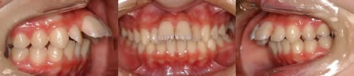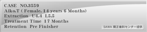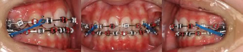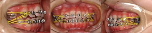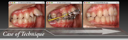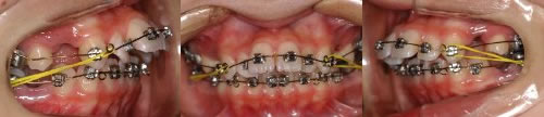 STAGE ONEでは「.016インチTIP-EDGE WIRE」と叢生、捻転も除去のため、Zing STRINGを使用して上顎側切歯を牽引する。右側切歯は近心が中切歯に重なっているため。BeggタイプのBracketを使用。顎観2級ゴムは60gである。Bite Opening Bendは上顎30°下顎20°である。(中略)